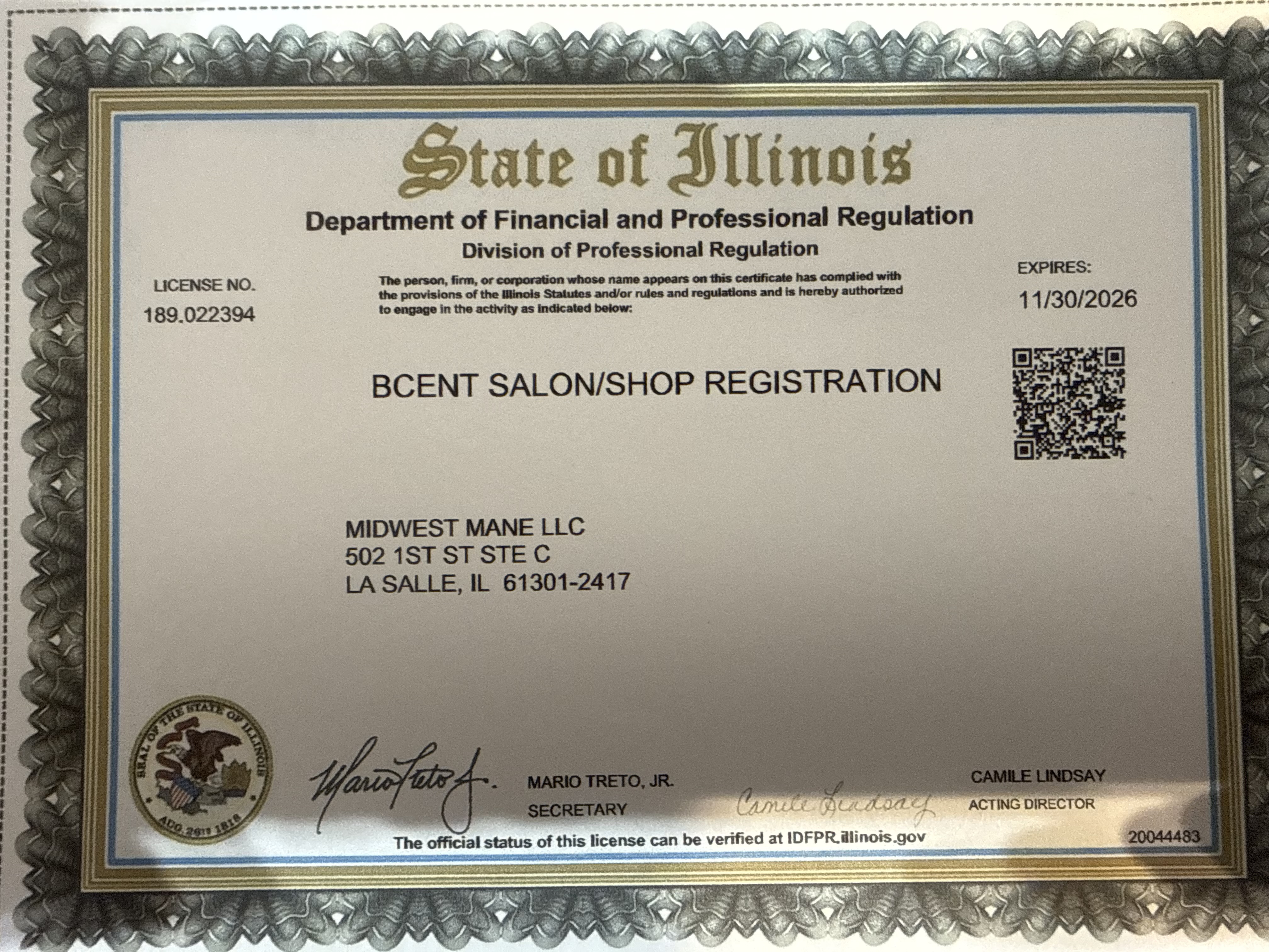| 01/01/25 | Megan Blankenhagen | Midwest Mane Co. | 502 1st St , Suite C | Lasalle | IL | 61301 | Pending |