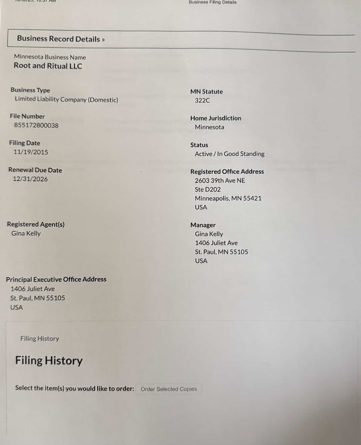 | 11/20/25 | Gina Kelly | Root & Ritual | 2603 39th Ave NE Ste D202 | Minneapolis | MN | 55421 | Pending |